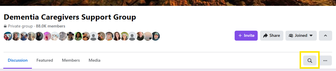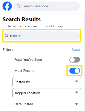 Use the magnifying glass/search bar inside each Facebook group to look for keywords that align with the types of support Qualicare offers.
