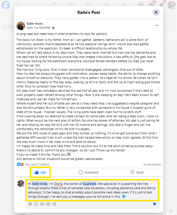 Once you’ve found posts from people asking for help, recommendations, or advice related to aging loved ones, caregiving, or home care, it’s time to engage with them thoughtfully and professionally.