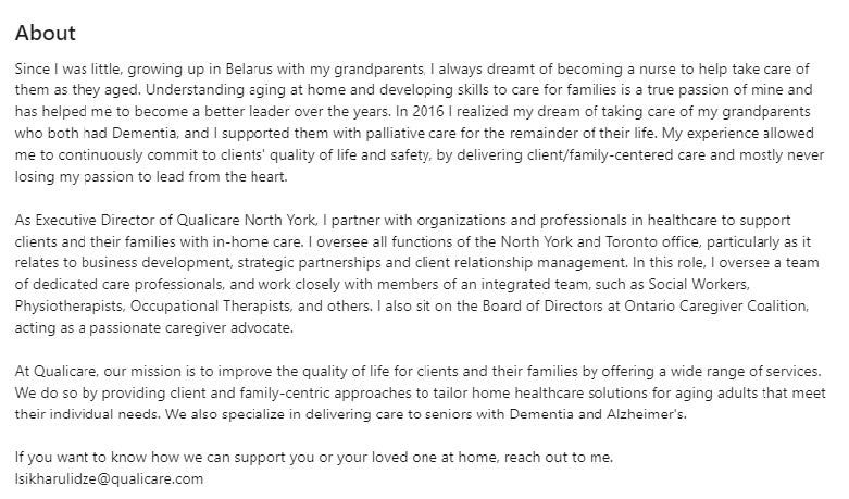 Transform your summary into a narrative. Instead of just listing achievements, share your journey, your passion for your work, and how Qualicare plays a role in your story. This personal touch helps build deeper connections with your audience.