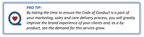 The Qualicare Code of Conduct is a set of client-centric standards that are the foundation of the Qualicare Brand Experience. The Code describes the behaviors and actions that, when delivered consistently by our franchise partners, link the Qualicare brand promise to the building of our brand reputation. This Code anchors our mindset and interactions,-bringing our company to life-and giving practical meaning to the Qualicare brand.