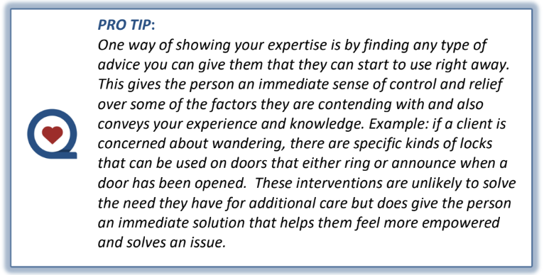 o Build Rapport – In any assessment, building a rapport with both the client and their family helps to show empathy, patience, and understanding. It also helps to create a level of comfort required when talking about having a caregiver in the home with a client with dementia or cognitive challenges.o Gather Comprehensive Information - Collect as much information as possible about the client's condition, needs, and lifestyle. Understand the client's daily routines, medical history, cognitive status, physical abilities, safety issues, and social and emotional needs. This will allow you to create a personalized care plan and share that care plan with the client and/or family, helping them to feel more comfortable overall.o Communicate Your Expertise - Discuss your experience and expertise in providing care for veterans. Not every agency will have the level of training and skill in caring for someone who may have challenges such as PTSD and it’s important that they understand you are better than the generic home care agency. Discuss any specialized training your caregivers have and how their skills will benefit the client.o Tailored Care Plan - Based on the assessment, develop a care plan that meets the specific needs of the client. Show the family how this plan will improve the client's quality of life and safety at home. One of the main goals for clients and/or their family members is to have the client stay at home for as long as possible – a personalized care plan provides a level of comfort that this is possible.o Address Concerns - Be prepared to address common objections or concerns, such as cost, quality of care, and changes in routine. Be open, transparent, and provide reassurance where needed. We will discuss common objections in more detail in the next section.o Provide Resources - Provide the client and their family with additional resources about veteran support. This could include educational materials, support group information, or other community resources. Use the professional referrals you’ve made in your marketing efforts to reciprocate recommendations. Not only will this help your client but it will also help to grow your relationship with the professional referral.